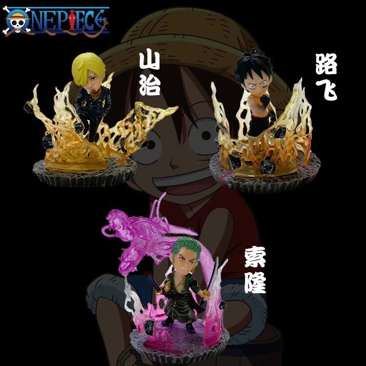 ワンピースのq版の戦闘シーンのルフィの索隆のエースの箱入りの手作りの人形の置物の模型