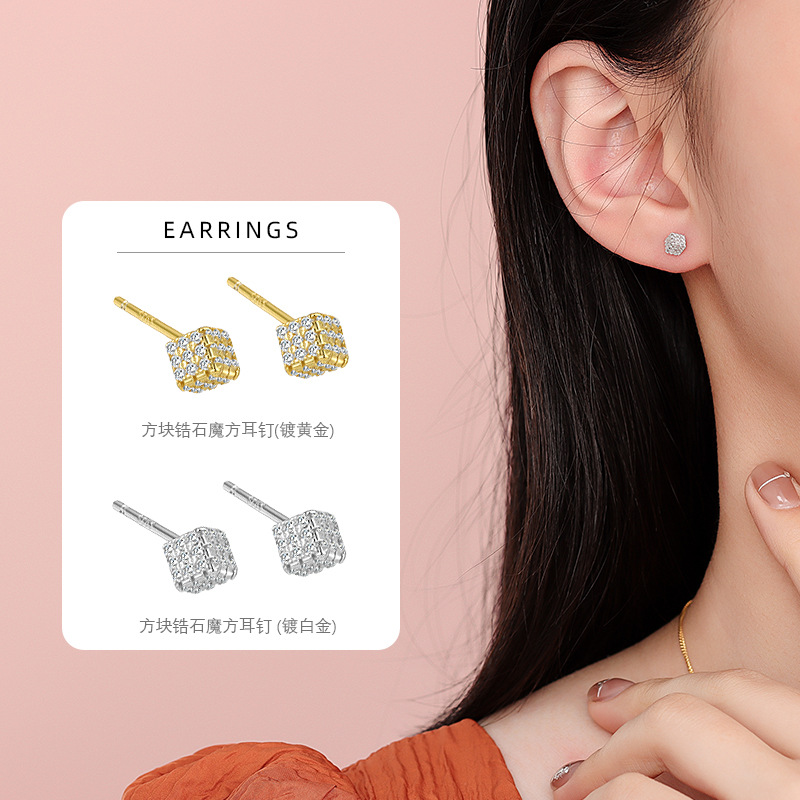 S 925純銀のダイヤモンドの四角のいっぱいなドリルのルービックキューブのピアス日韓の気質はk金をめっきします。