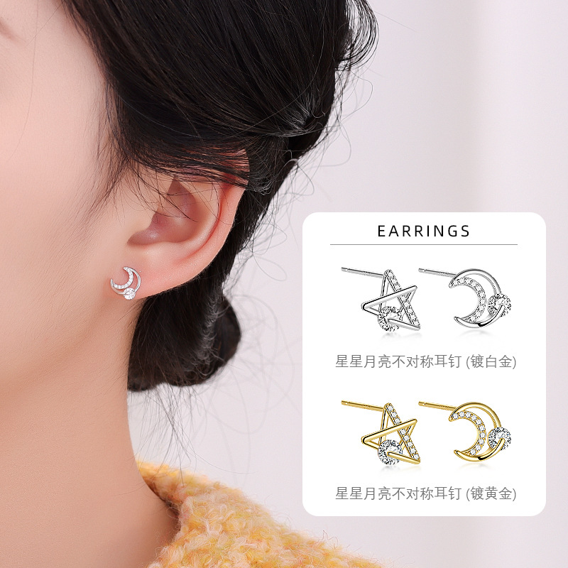 S925純銀のダイヤモンド星月非対称高級感ピアス夏ins風星月精致気質耳飾り