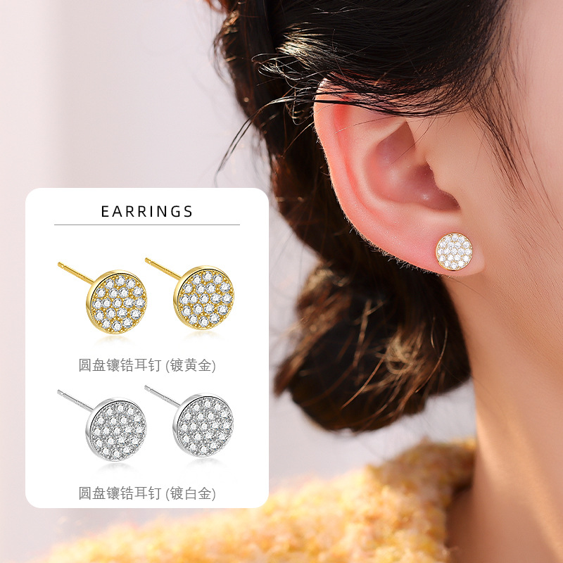 S925純銀のダイヤモンドが丸みを帯びた円盤のピアス