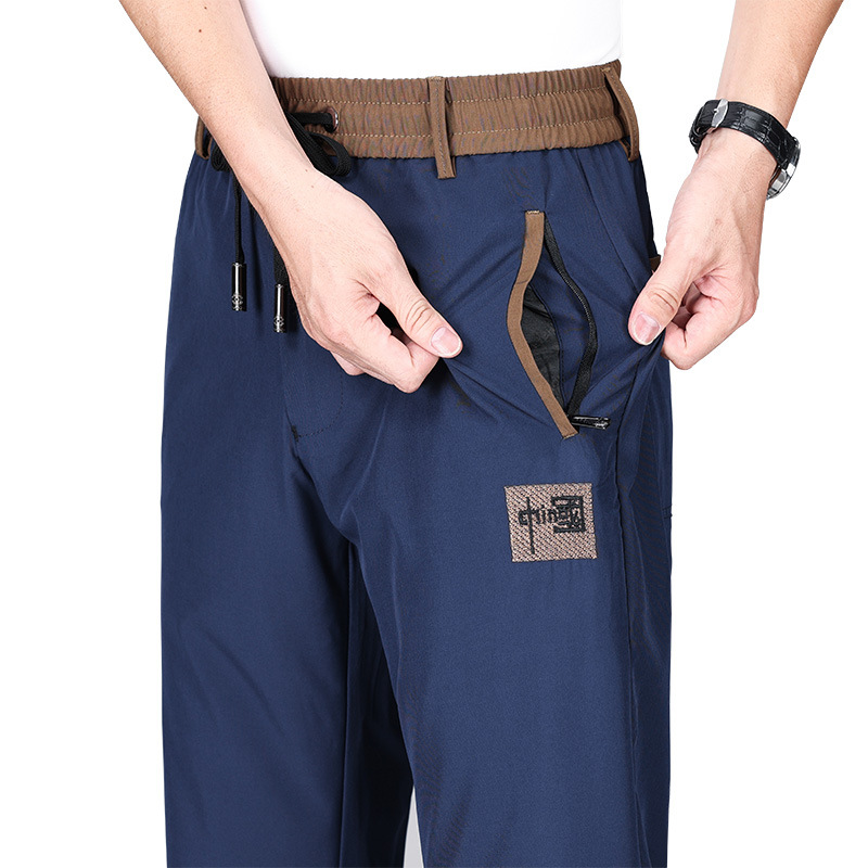 カジュアルパンツ男の夏の薄いタイプのウエストを緩めているスポーツパンツのストレート筒は袋の弾力性の男のズボンの快適な氷の糸の男のズボンを貼ります。