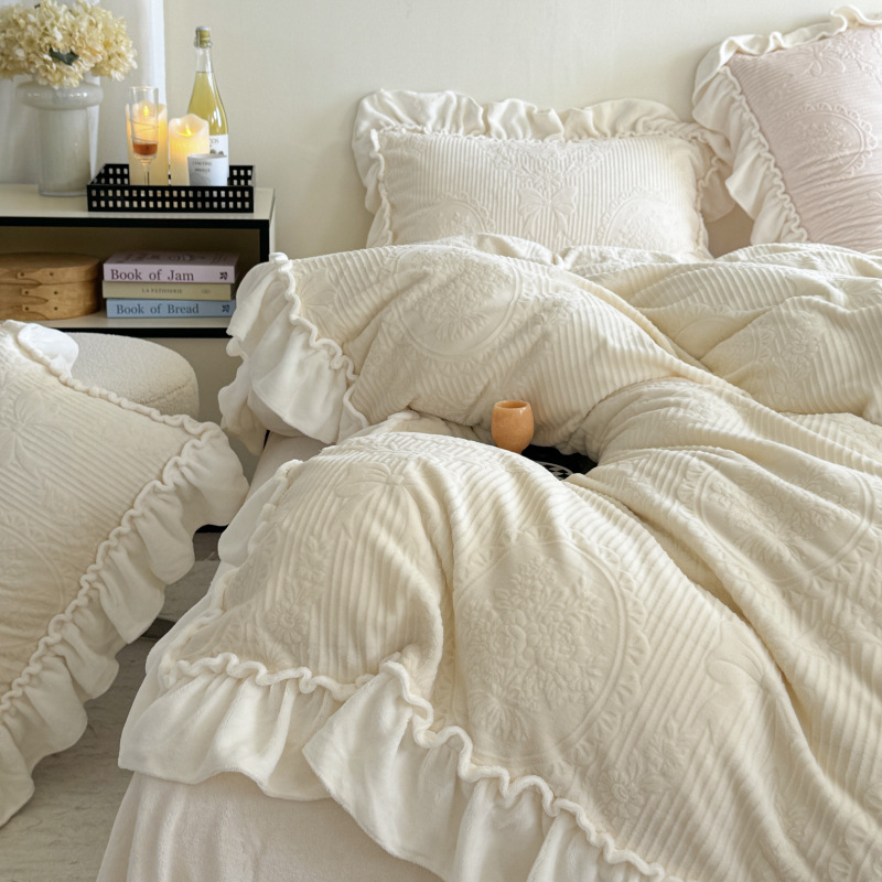 Insレースのミルクの毛の4つのセットは厚い毛の表面の秋冬のサンゴの毛のぬいぐるみの布団のシーツのベッドの上で4、3つのセットです。