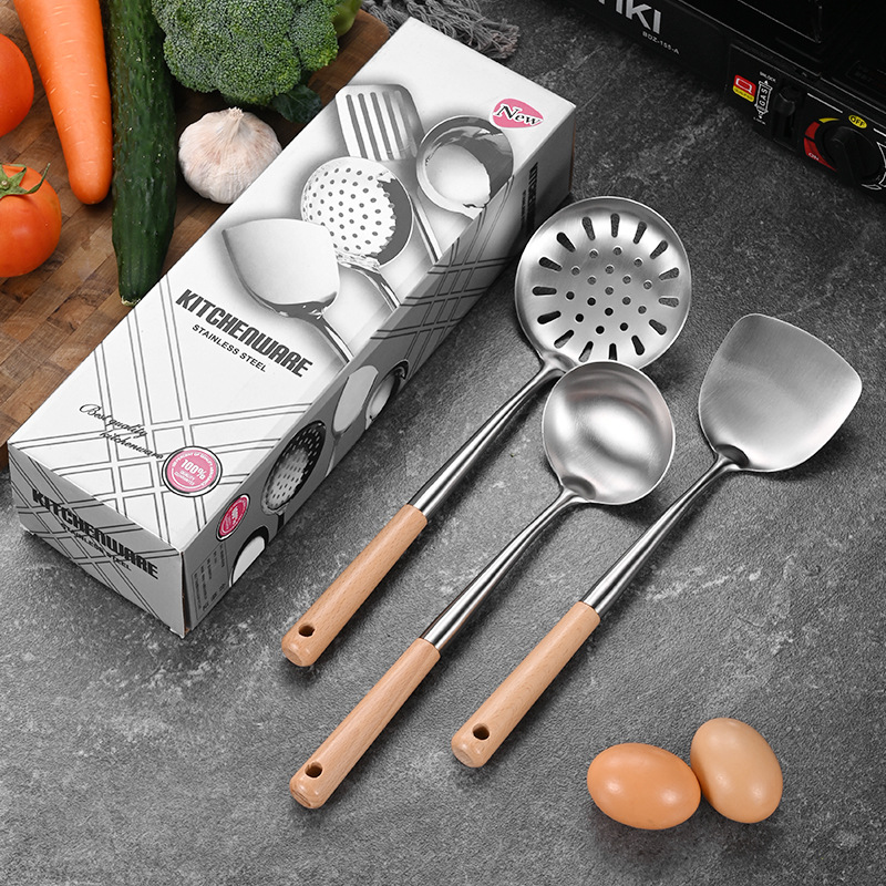 304ステンレスのケヤキの柄の調理器具セットの小型家庭用おかゆのスプーンの大きいスプーンの野菜のシャベルの3セットのプレゼントの箱の中で