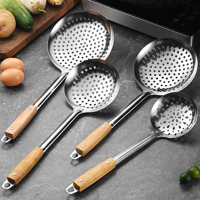 ステンレスの木の柄のスプーンの家庭用業務用レストランの揚げ揚げ餃子のすくい面の水切りのスプーンは台所用品を濾過します。