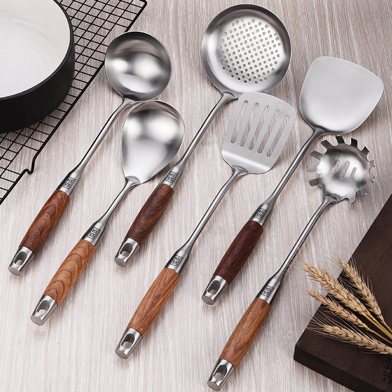 卸売り304ステンレスシャベルスプーン調理器具セット延長ユーカリハンドル調理料理人シャベルシャベルスプーン