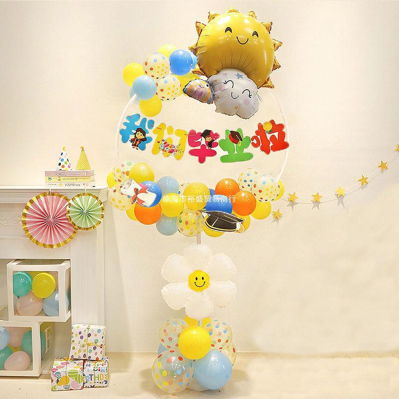 卒業の楽しみは風船の柱を飾って幼稚園の小学校のクラスの式典の季節のシーンを飾って撮影の道具を手配します。