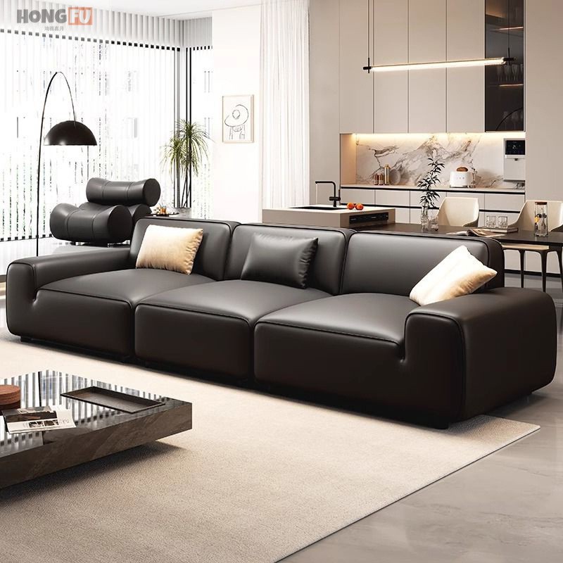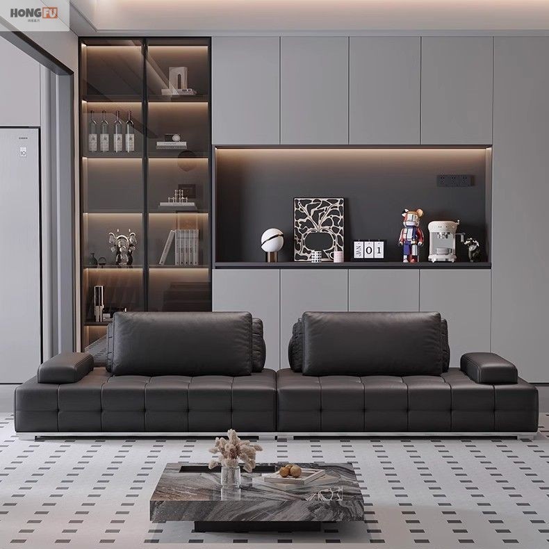 ビッグブラック牛革ソファ第一層牛革イタリアンレトロ黒豆腐ブロックリビングルームストレートモダンシンプルソファ