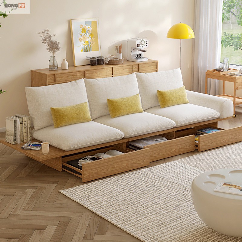 引き出し付き無垢材の和風フロアソファ、小さなリビングルーム、取り外し可能で洗える布製のフロアタイプの和風ログソファ