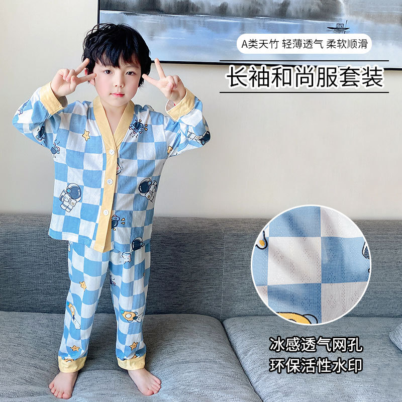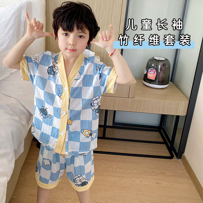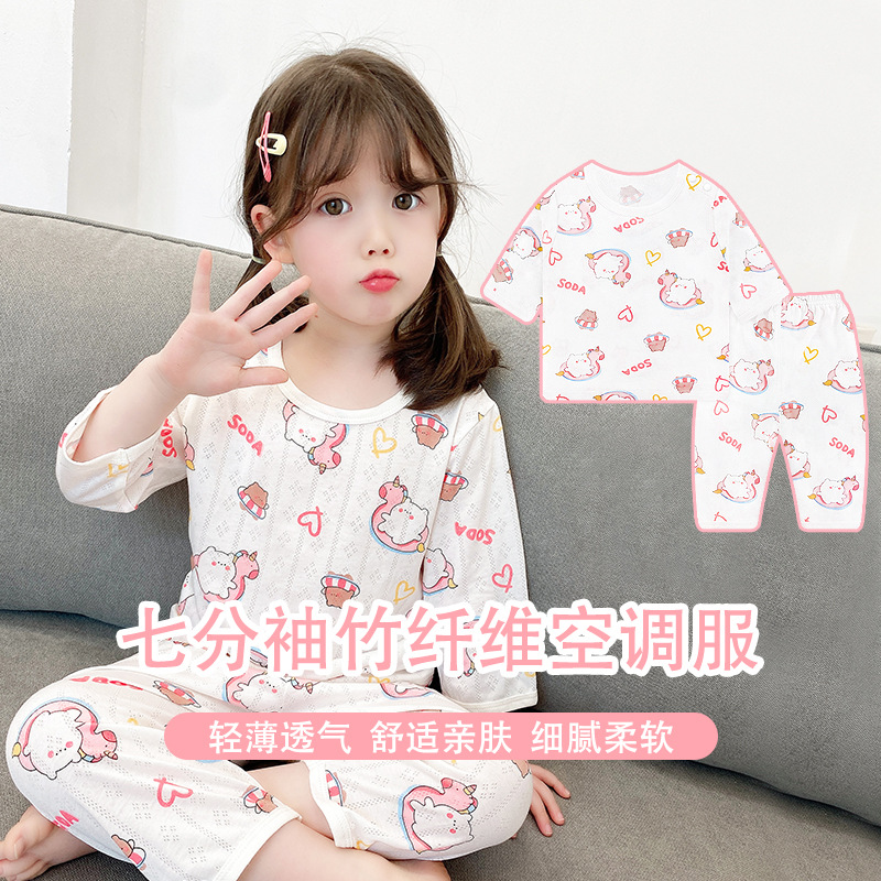 子供の竹繊維のエアコンの服のスーツの男の子の女の子のパジャマのカバーの7分の袖の夏の薄い通気性の2023年の夏
