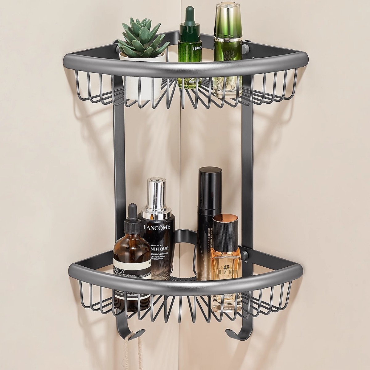 ブラッシュガングレー全銅三角バスケット二層フック付き壁掛けバスルーム洗面台シャワージェル収納ネットバスケット