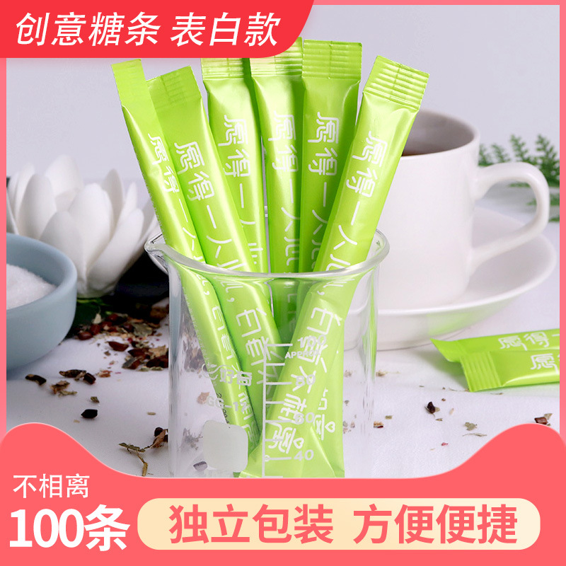クリエイティブな砂糖パックのコーヒーパートナーの砂糖の白い砂糖パックの砂糖は、緑が100本の小さな包装から離れていないことを示しています