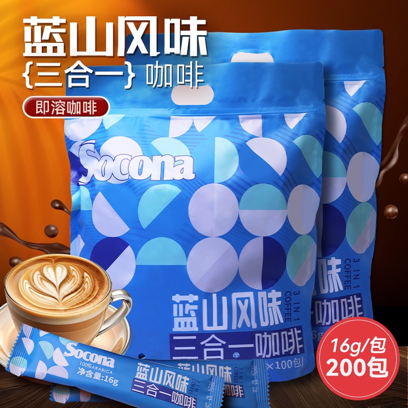 SOCONAブルー山風味三合一インスタントコーヒー16g * 200本入り特濃ラテコーヒーホテル業務用