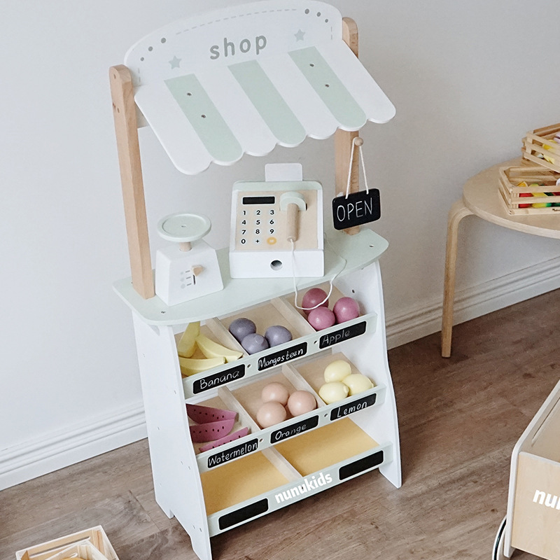 国境を越えた子供たちは台所のおもちゃを売って果物屋の売店を売っているスーパーのレジのパン屋で買い物をしている
