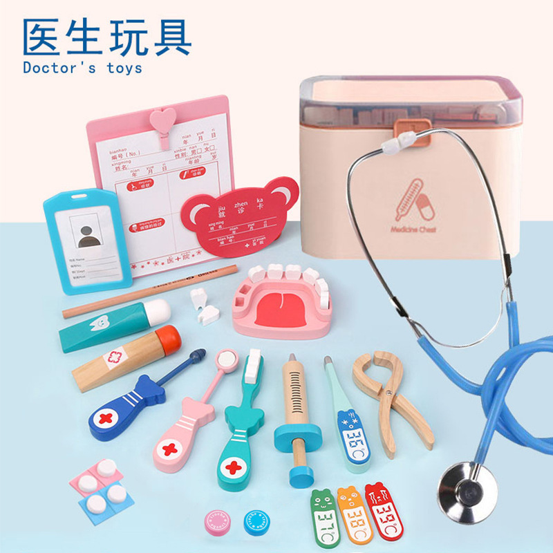 子供のシミュレーションのままごとの種類は聴診器の小さい医者のおもちゃのセットの男の子の女の子の桶を打って木のおもちゃを詰めます。