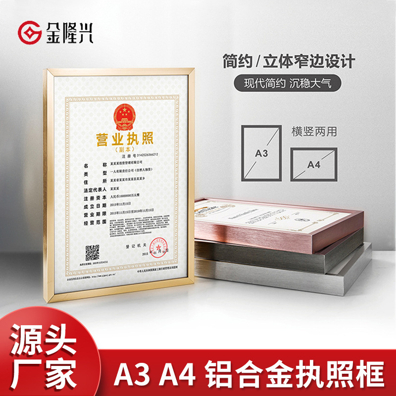 元のメーカーの金隆興a 3アルミニウム合金フォトフレームa 4金属額縁ビジネス高級会社の執照枠卸売り
