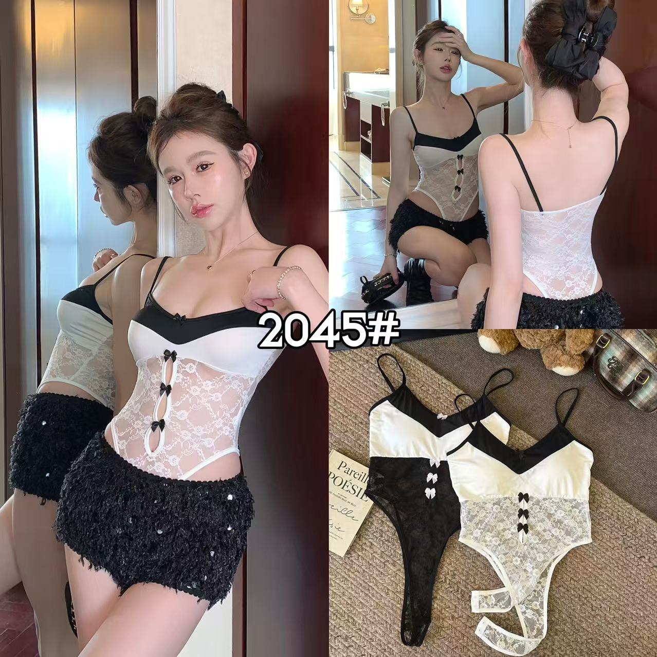 2045 # 純粋な欲望甘い中空弓コントラストレースサスペンダージャンプスーツセクシーなウエスト露出タイトなベースレイヤー