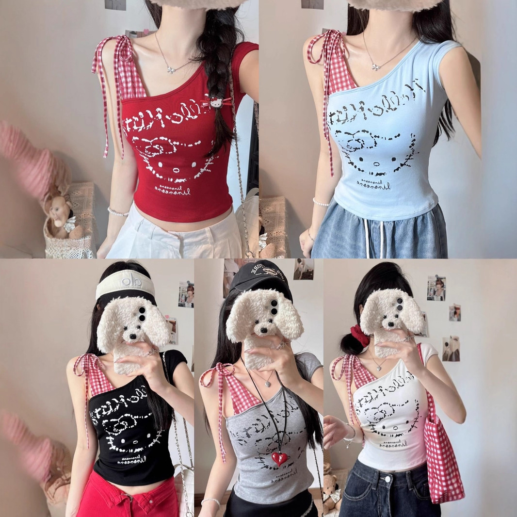 5118 # 夏の新しいTシャツ漫画kt猫プリントスプライシングチェック柄レースアップスリムで多用途な胸パッド付き