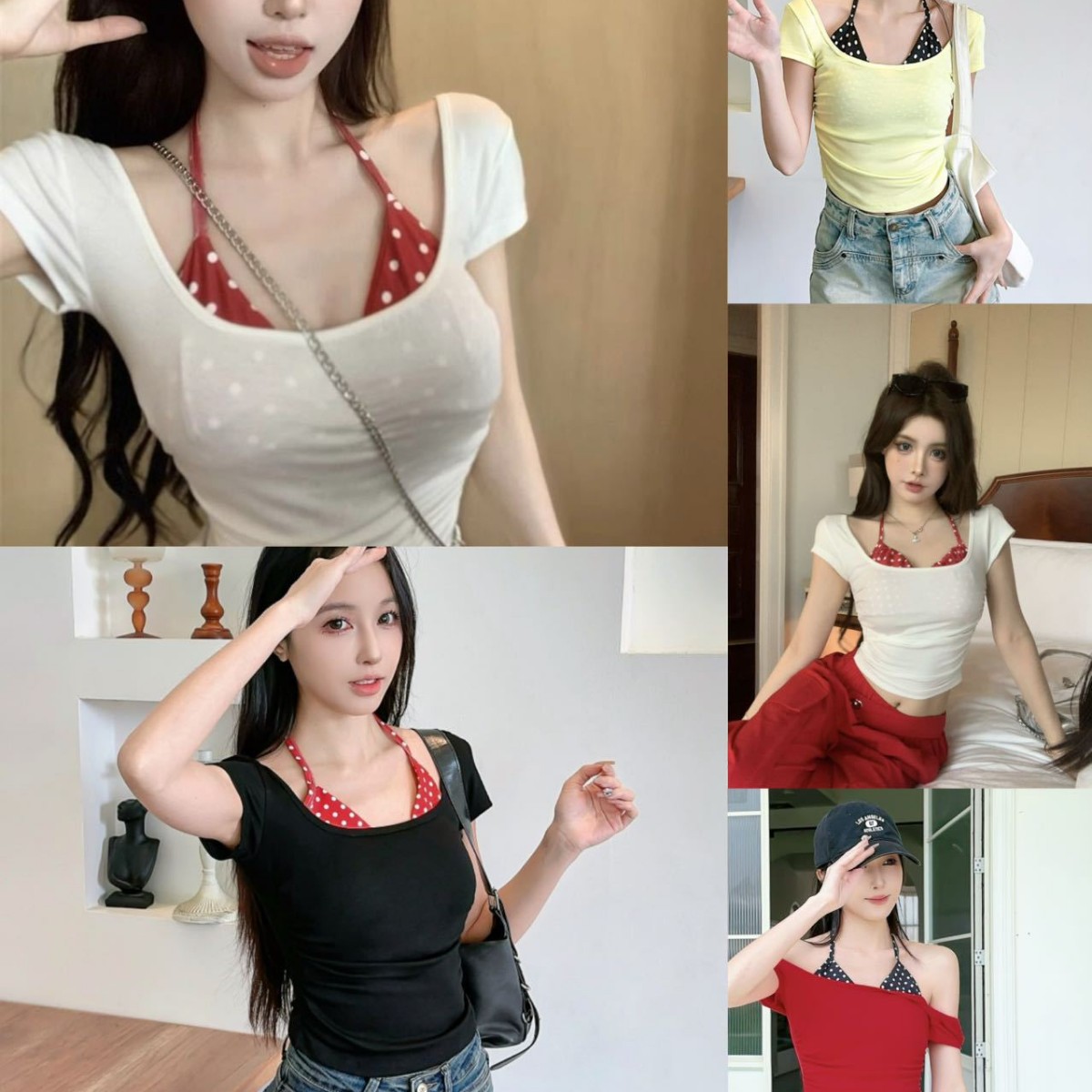 1837 # 純欲ギャルのデザイン感波点首を掛けて偽の2つのtシャツを着ます。