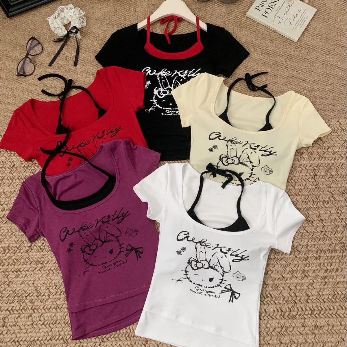 1927 # 新しいステッチ偽ツーピースベスト Tシャツ女性の夏のデザインニッチオフショルダー甘くてスパイシーなショートトップ