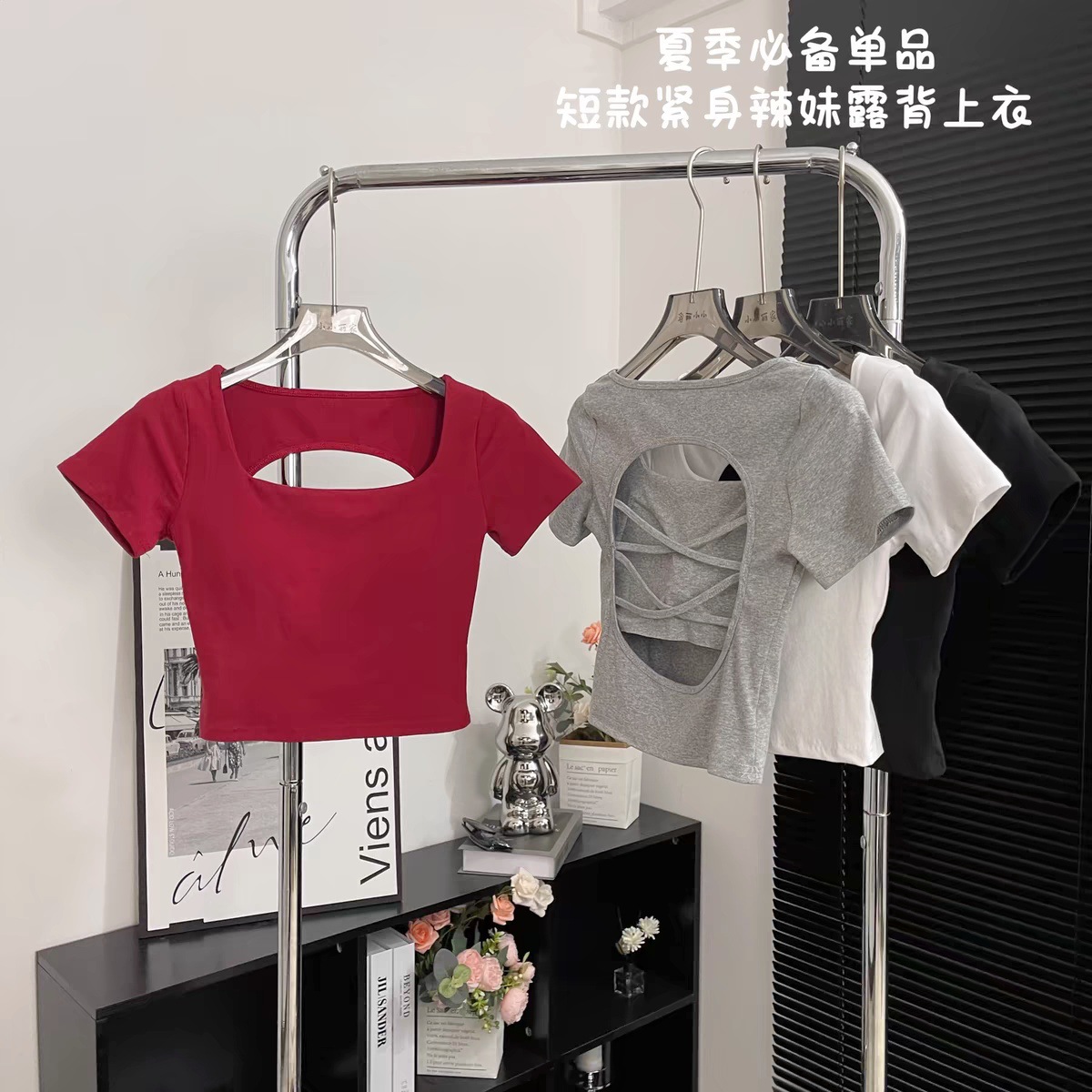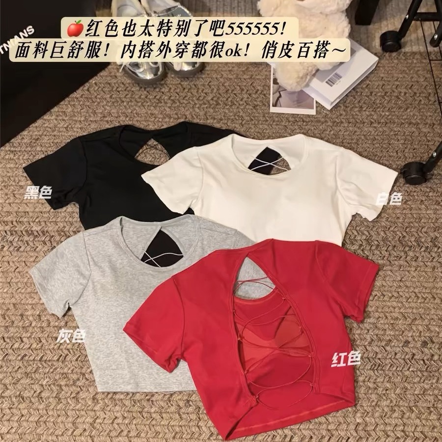 A072 # 新型クロス透かし半袖tシャツ女性は胸パッドギャルの短い上着を持っています