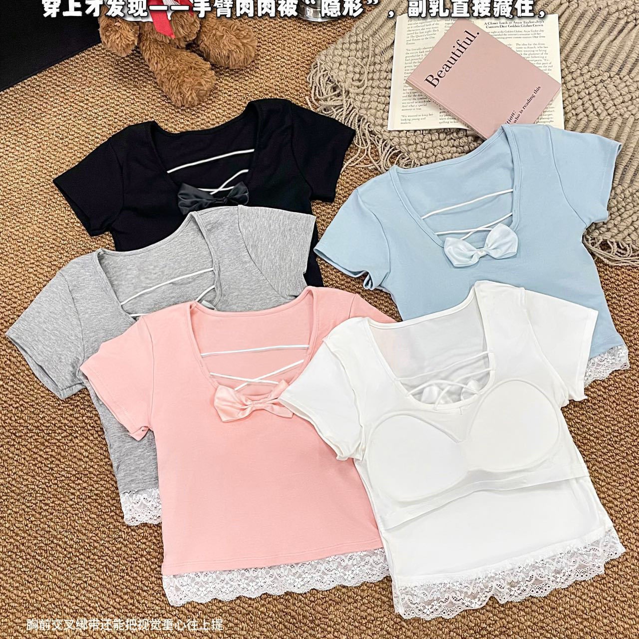L3317を日本語に翻訳してください # 新しい純粋な欲望スタイル Tシャツ女性の半袖夏スリム U ネックリボンレースデザイントップ