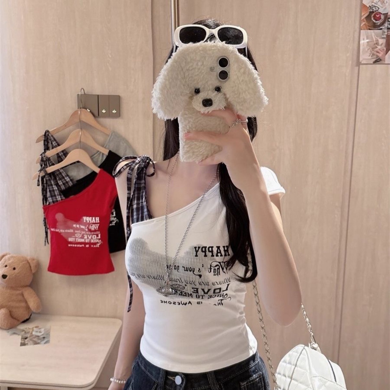 66013 # # 夏の新しい甘くてセクシーなレタープリントチェック柄ストラップキャミソールオールインワン胸パッド付き