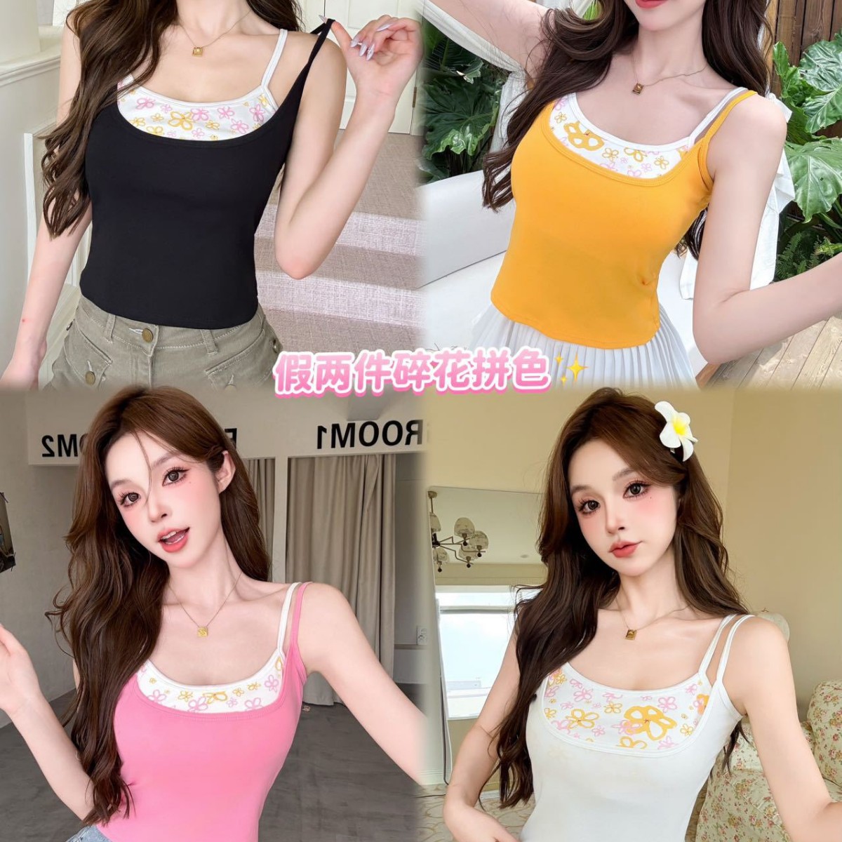 66002 # 夏のホットガールレースチェック柄偽ツーピースコルセットキャミソール女性のチェック柄コントラストカラートップ