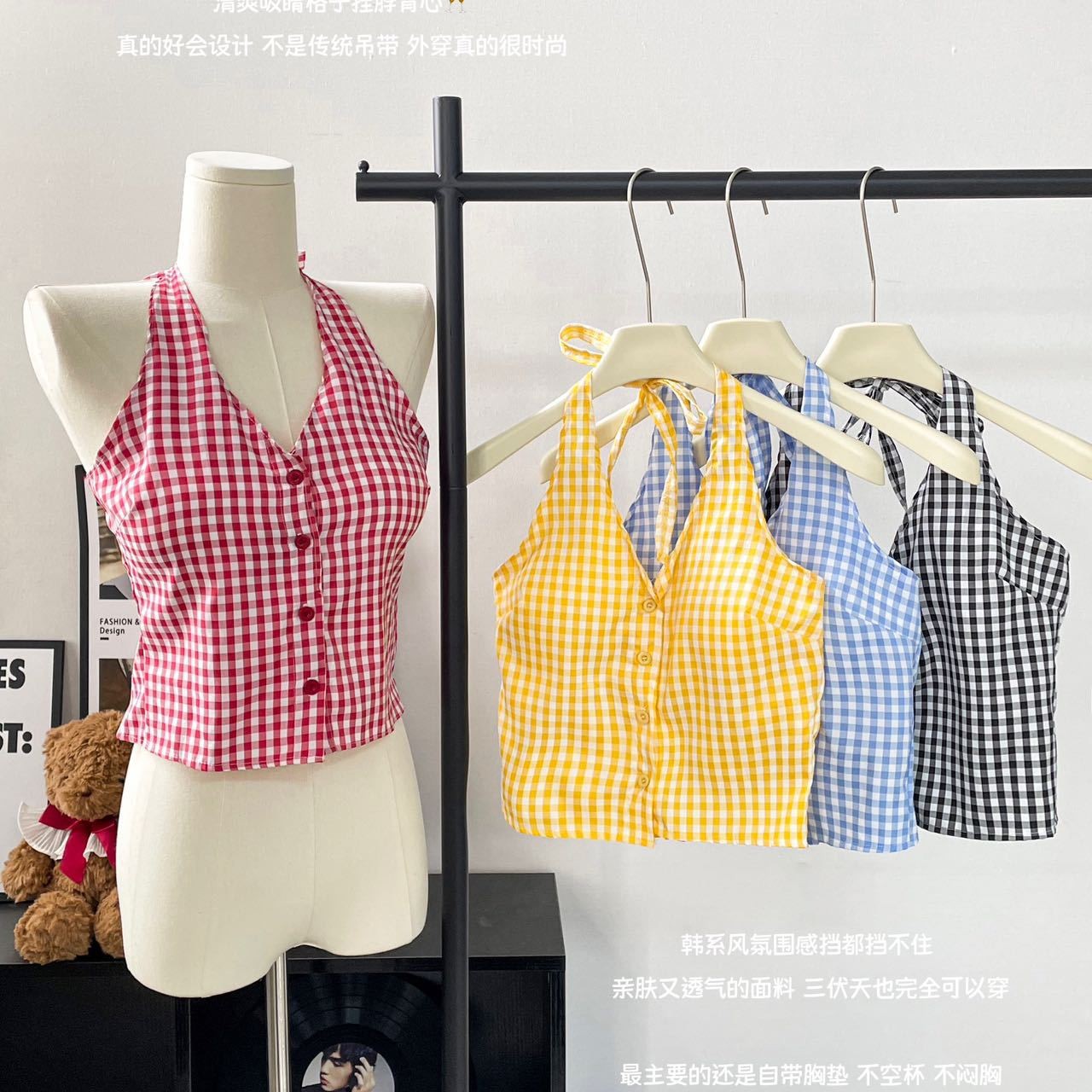 L5312を日本語に翻訳してください # 甘いレトロなチェック柄バックレスホルターネックキャミソールレディース夏スリムフィットインナーショートトップ