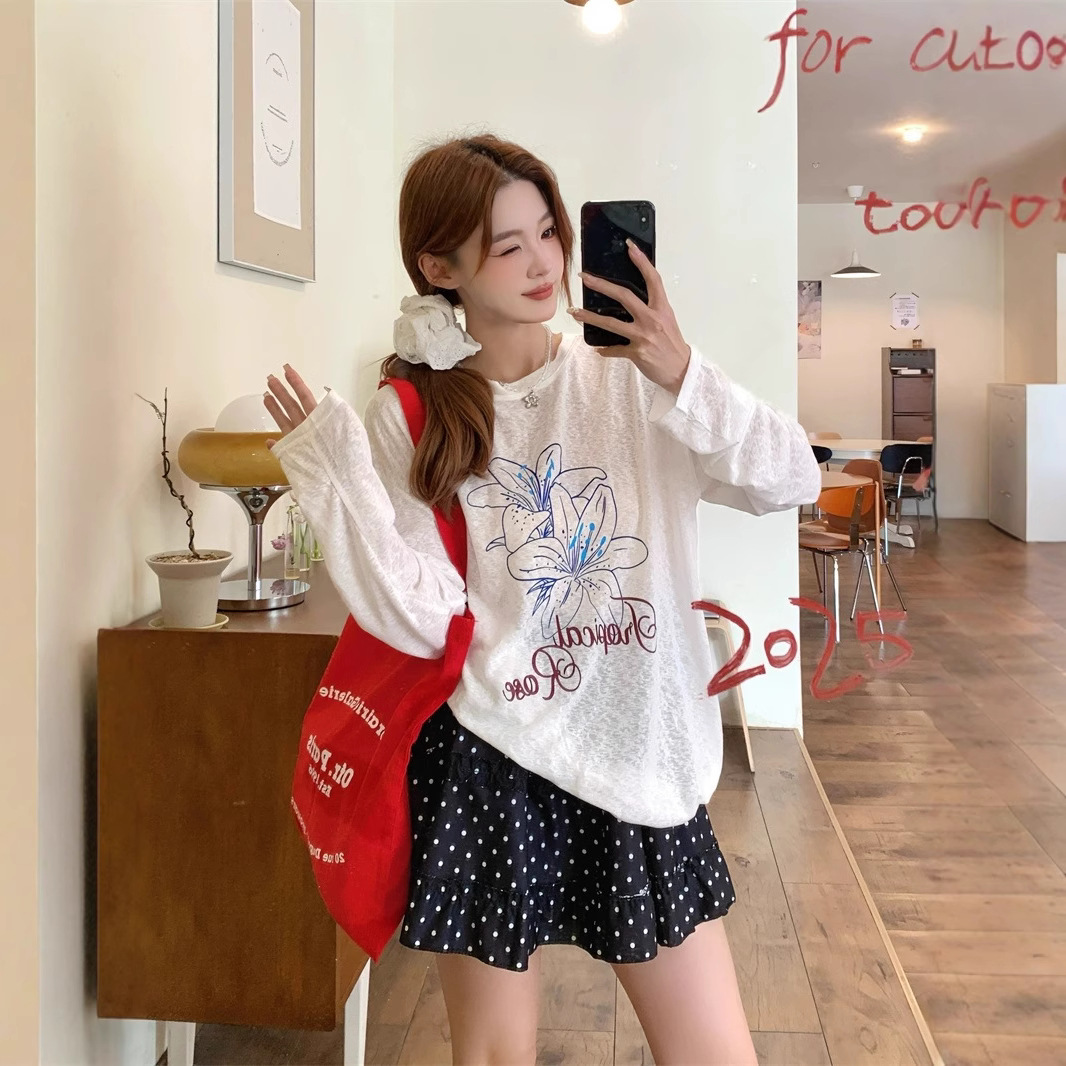 2073fs に変換 # 2025 パピープリント薄い日焼け止め Tシャツ女性の夏カジュアル怠惰なルーズブラウス底長袖