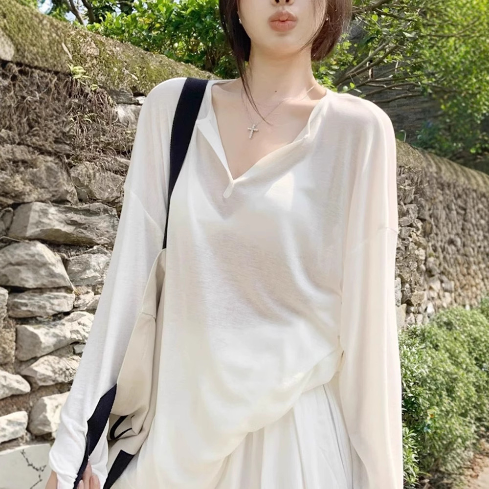 2088 # 日焼け止めブラウス 2025 新しい微透け長袖 T シャツ薄いアウターホワイトチュールトップ