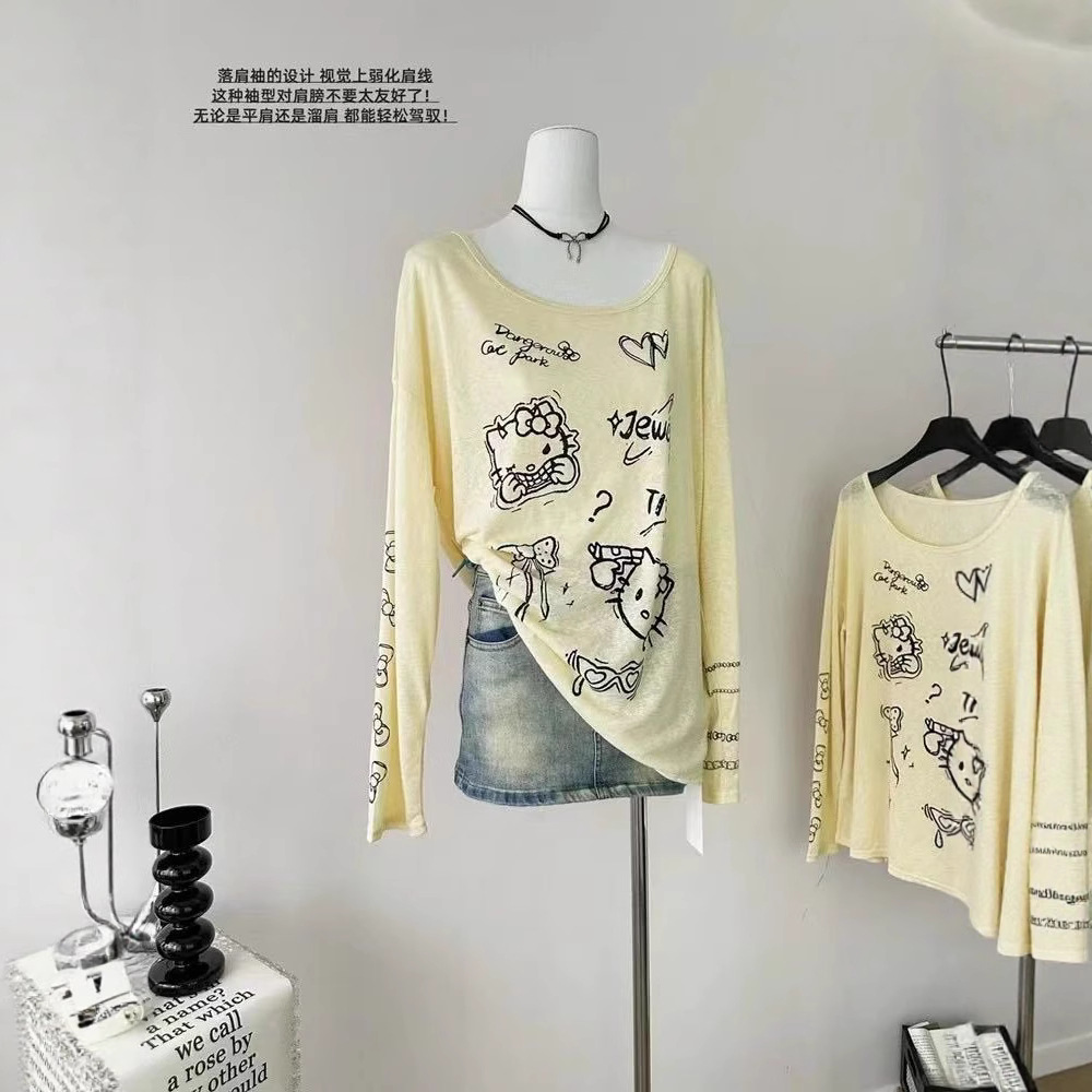 2081fs アメリカングラフィティプリントオフショルダー Tシャツレディース新作薄手日焼け止めブラウスルーズオフショルダー長袖トップ