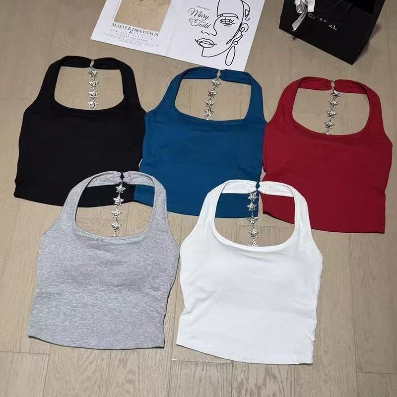 1908 # 夏のファッショナブルなホットガール、ピュアな欲望スタイル、スターダイヤモンドチェーン、美しいバックホルターネックサスペンダー、胸パッド付き、スリムフィット