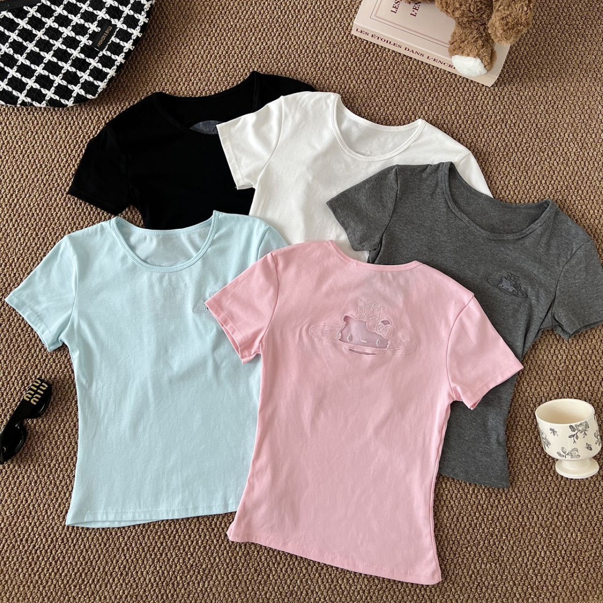 1866 # キティ中空刺繍右肩半袖 Tシャツ女性の夏のホットガールファッション多用途トップトレンディ
