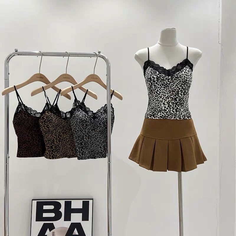 1818 # セクシーギャルヒョウ柄レーススリムキャミソールvネック美背中インナーオーバーオール式トップス