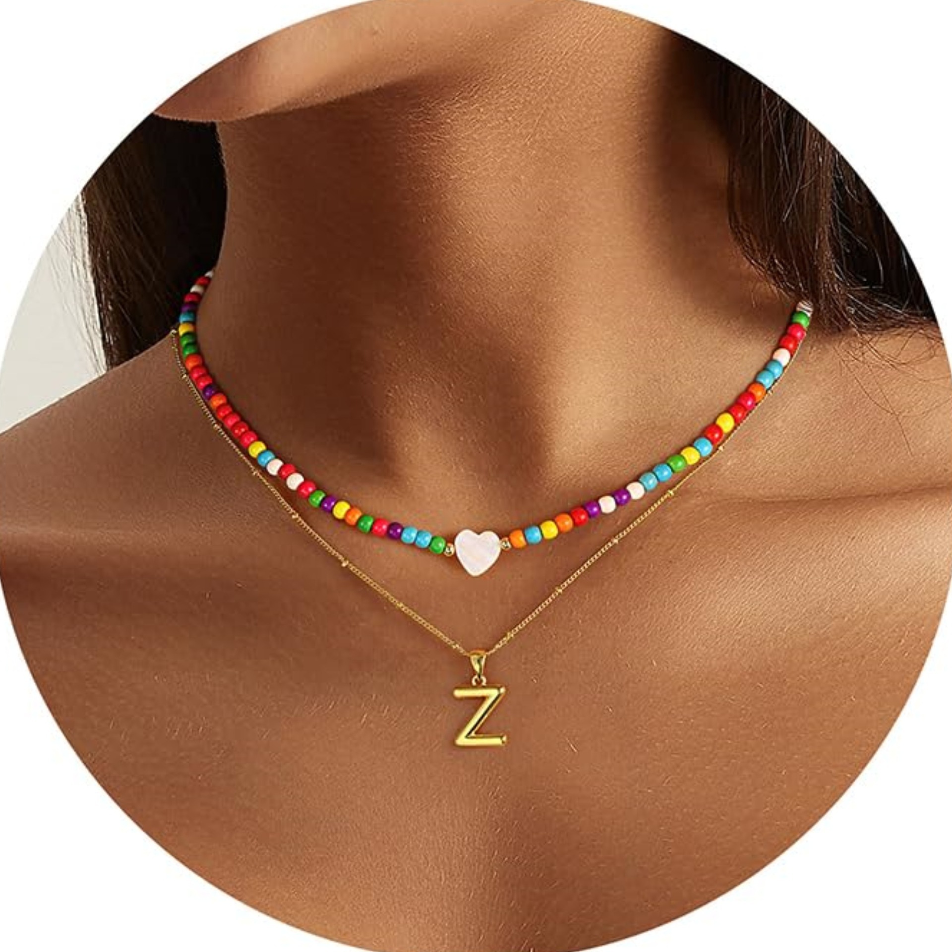 欧米の国境を越えた新型26文字ペンダント層鎖天然石愛ドーパミン配色ビーズネックレス
