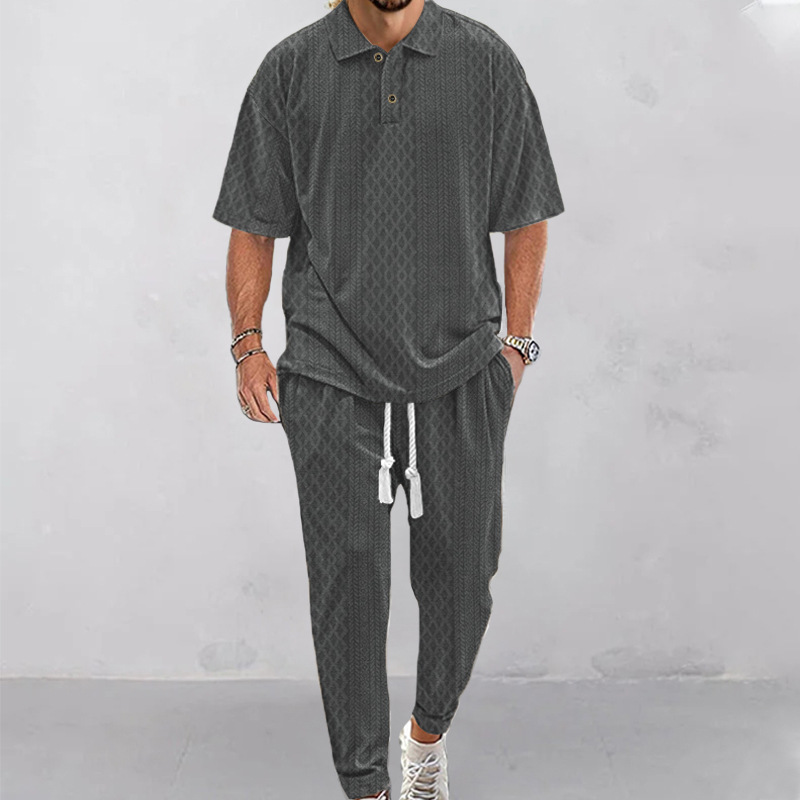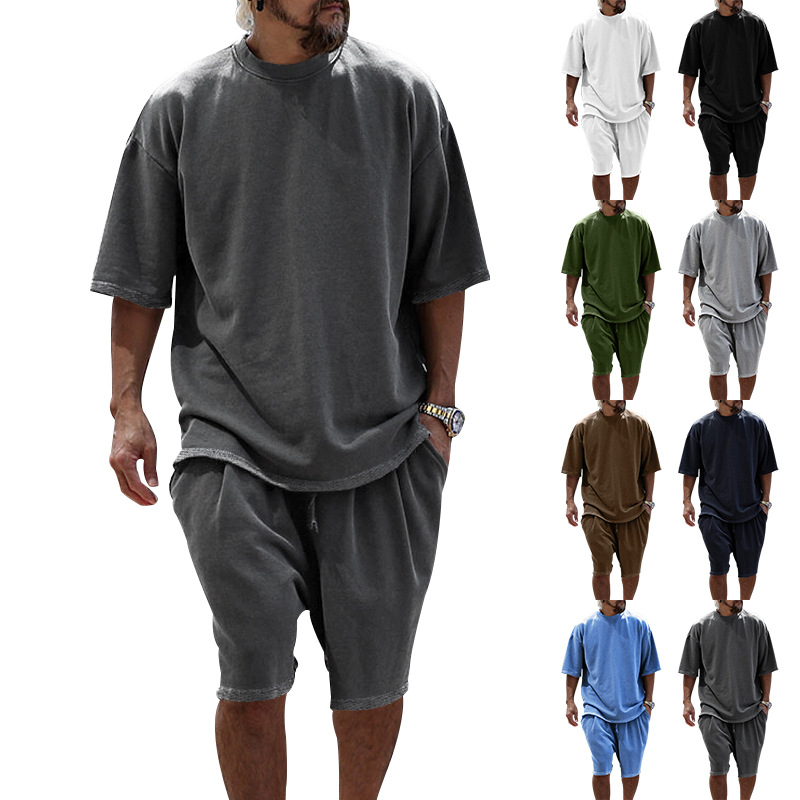 国境を越えた男性服セット欧米2024夏の純色カジュアル丸首シャツ運動レジャーパンツ2点セット男性