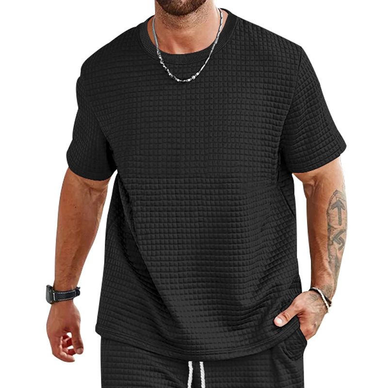 独立駅の新型男性スーツ夏服2025欧米男性ワッフル通気カジュアル半袖半ズボン2点セット