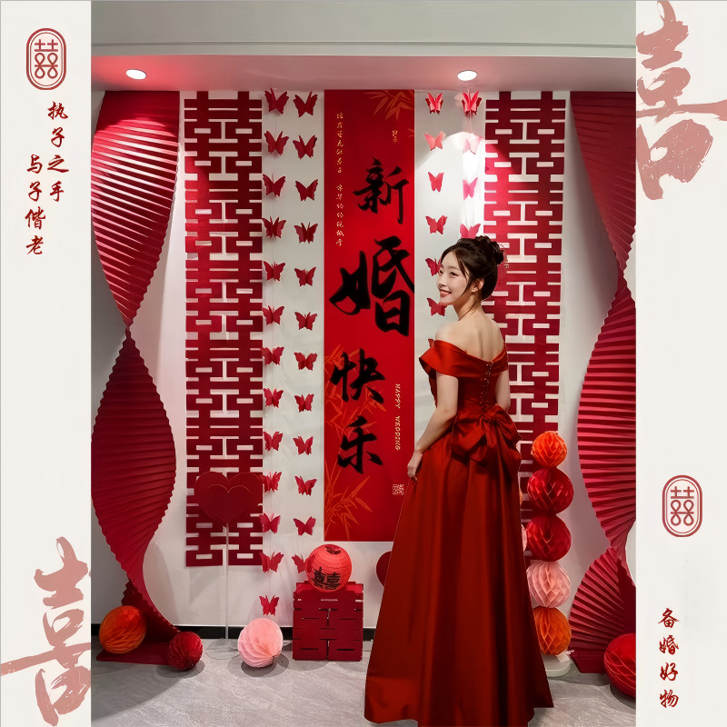 結婚式の部屋の装飾セット、結婚式の吊り下げ布バナー、新しい家の寝室の装飾、ハッピーワード、ドレッシングガウンの背景壁、写真小道具