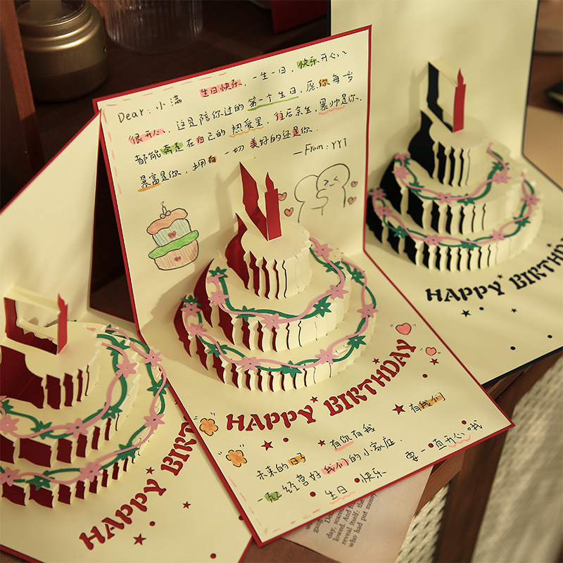 誕生日グリーティングカード 3D 立体ケーキ インスタイル ニッチ ハイエンド ギフト メッセージ ブレス カード ギフト 男性と女性の友人用