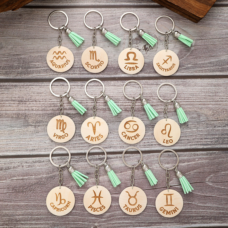 新商品農場シンプル風木製円形十二星座アルファベット柄キーホルダー