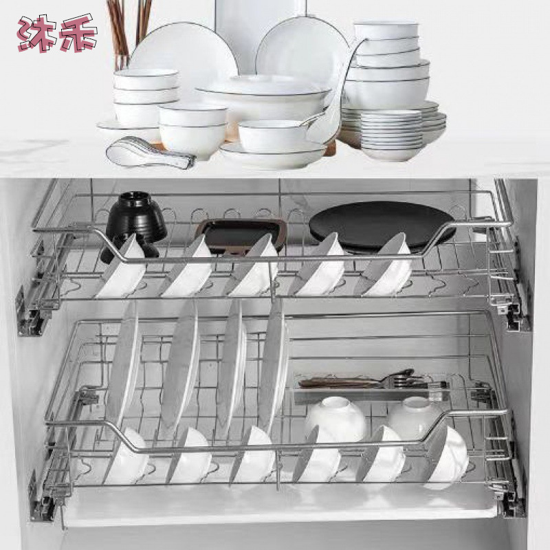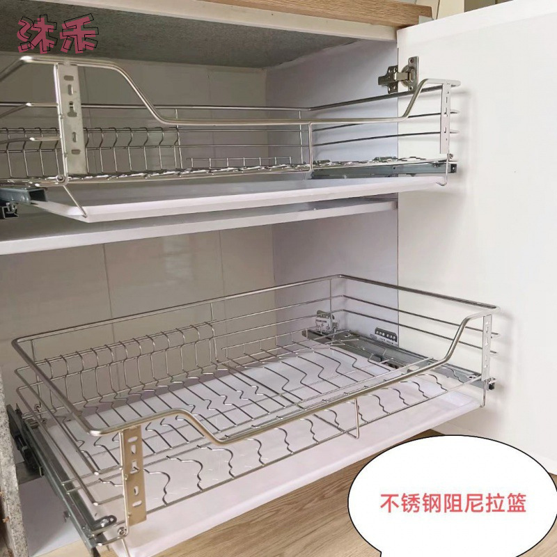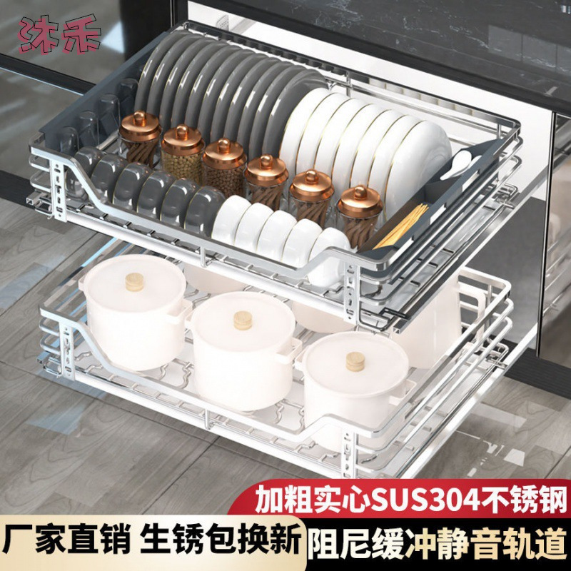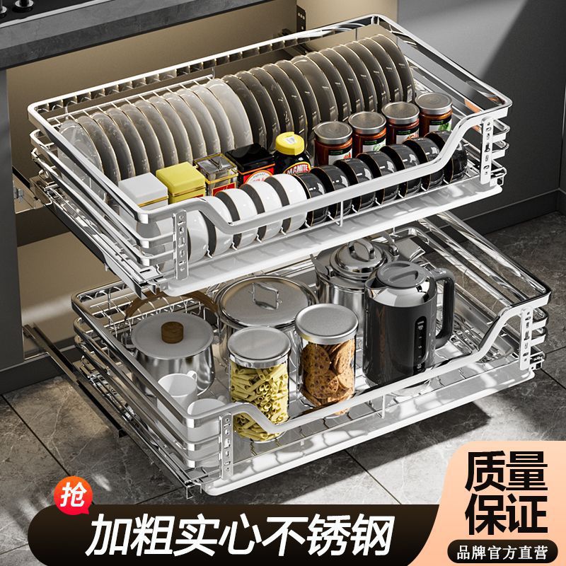 キッチンバスケット304ステンレス2層キャビネットバスケットダンピング緩衝シュート食器棚収納厚い食器棚