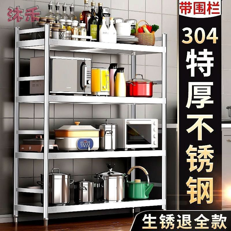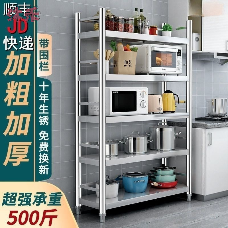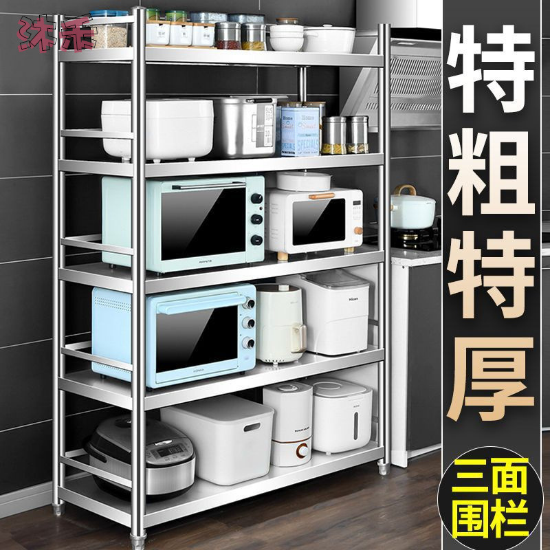 特厚304ステンレスキッチン棚新型床置き多層収納棚電子レンジ棚棚棚フェンス付き