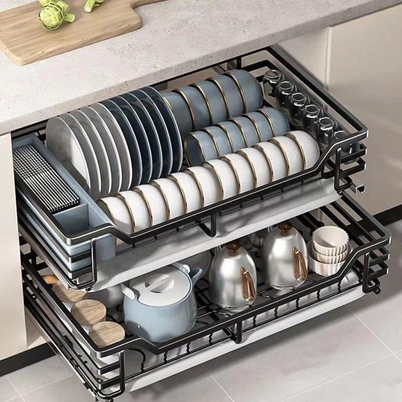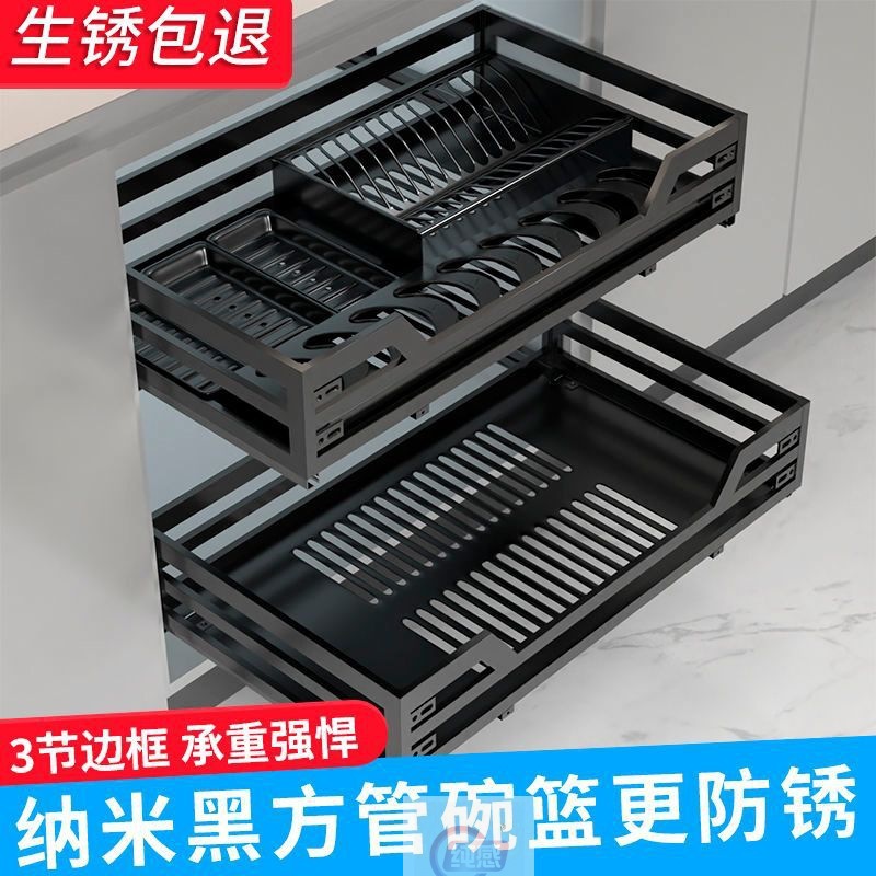 台所の食器皿かごナノ黒引きかごステンレスダンピング緩衝戸棚引き出し式食器棚二重引きかご