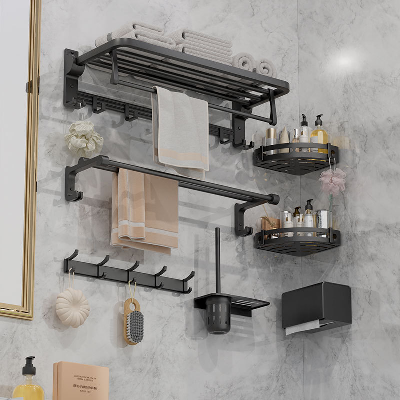穴あけ不要の黒色スペースアルミ製バスルーム金具セット、トイレタオル掛け、バスタオル掛け、収納ラック、軽奢