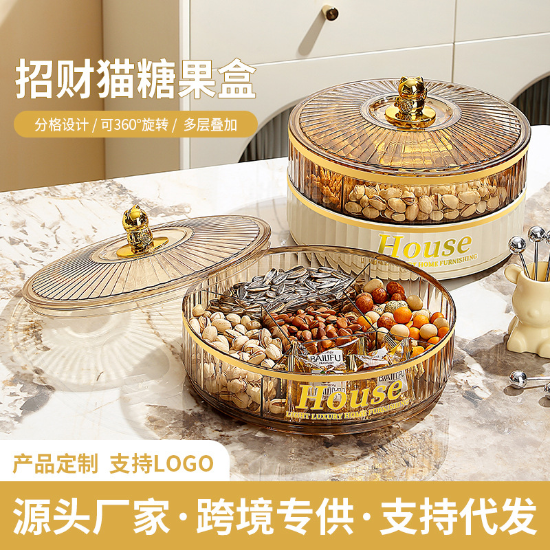 新年食品級招き猫果盤ナッツ乾果盤新型分格蓋付き密封家庭用回転キャンディー盤