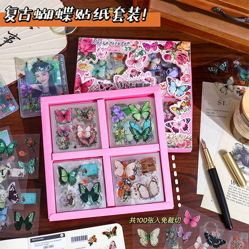 レトロ蝶ステッカーセットクリエイティブレトロ手帳ステッカーDIYカード装飾ステッカー100枚紙箱