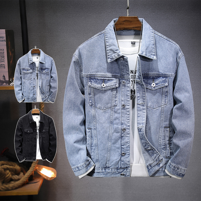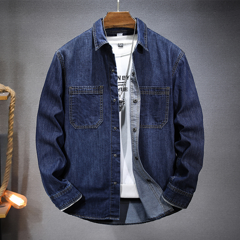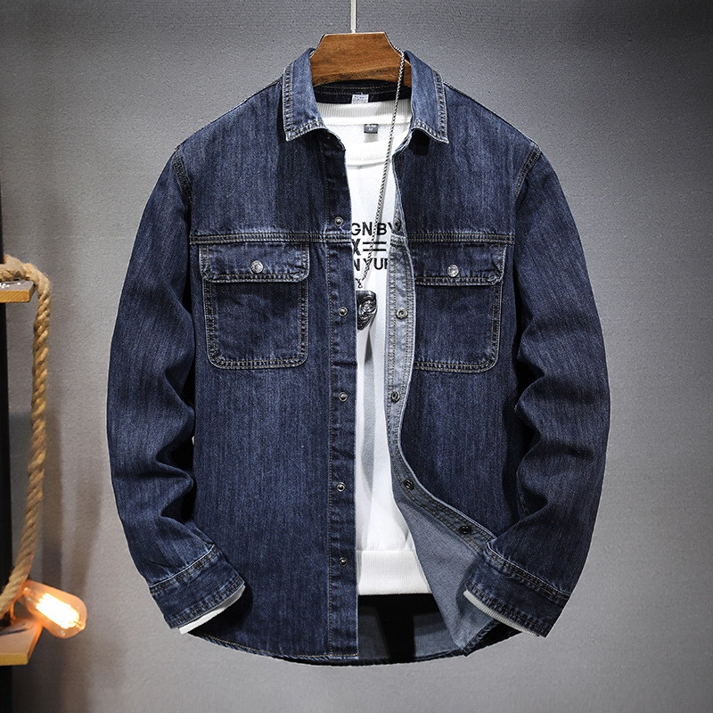 2025春の新型男性カジュアル襟シャツ高級ブルー水洗いゆったり長袖デニムシャツコート