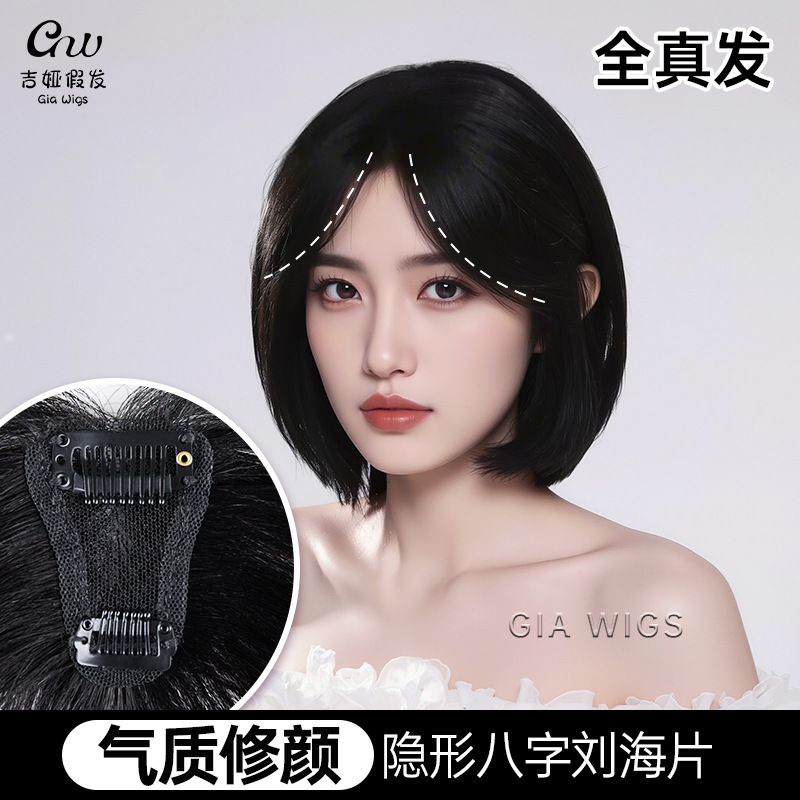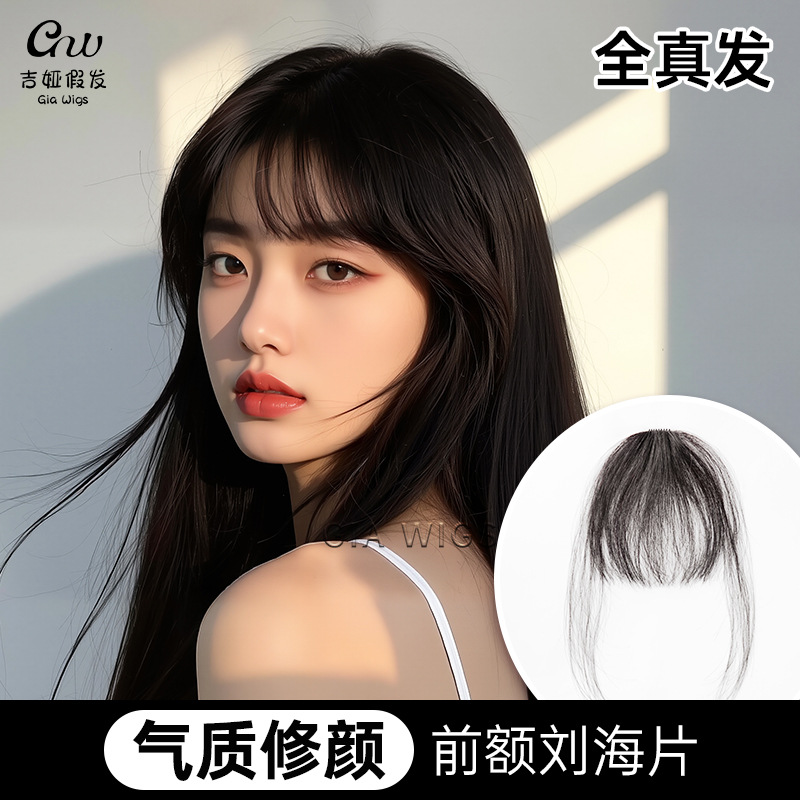 自然な黒い漫画の前髪のかつらの女性は顔の形を飾って額を覆います。