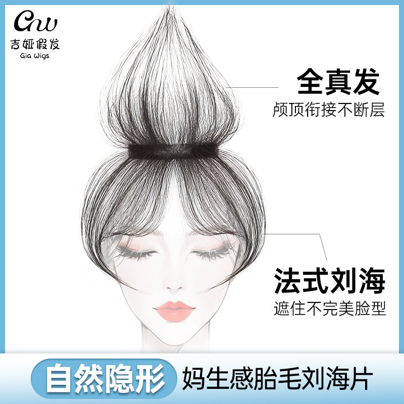 自然に痕跡のない本物の髪の高い頭の上に白髪の額を隠して一枚の胎毛前髪を覆います。