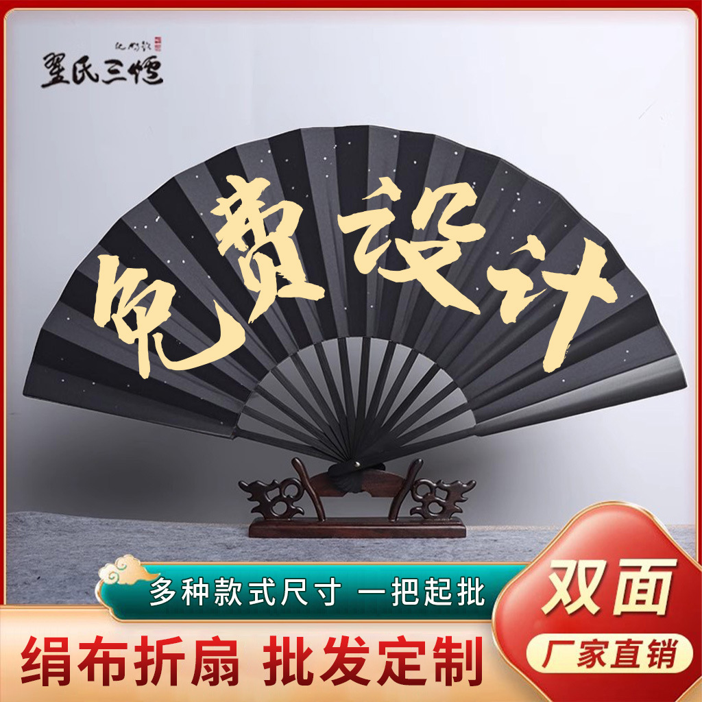黒と金の絹の扇子、空白の折りたたみ扇子、DIY書道、古代風、中国風の文字、セイコー扇子